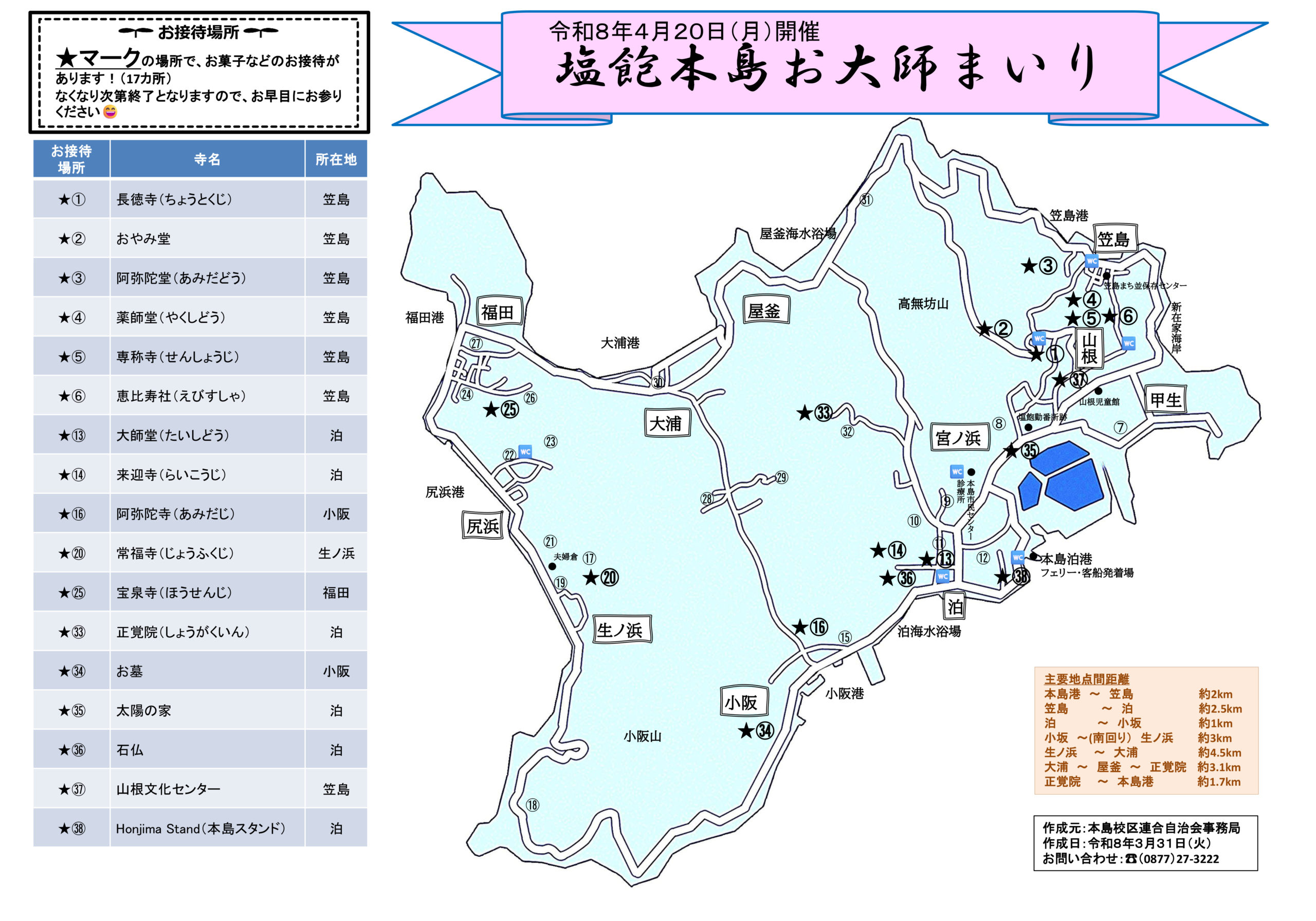 EVENT 2026.03.31 令和8年4月20日(月)お大師まいりのマップ公開! 令和8年4月20日(月)朝~昼頃まで開催予定の「お大師まいり」お接待場所等のマップを公開します。 現時点での情報となりますので、最終版は当日本島港でお配りするマップをご利用ください。