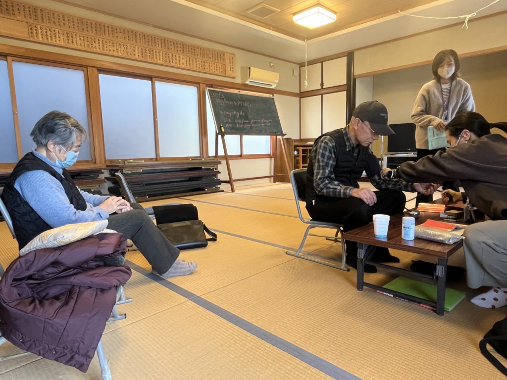 令和7年12月23日(火)、笠島集会場で笠島地区の健康相談が行われていました。体組成計を用いた体重、体脂肪、筋肉量、骨量の測定や血圧測定、検尿のデータを基に、保健師さんが一人ひとりに丁寧に聞き取って、健康管理をされている様子でした。
