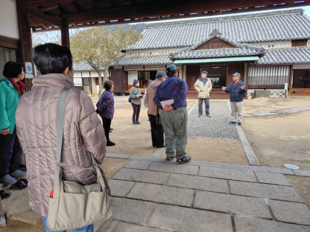 文化観光部会の部会長で、本島ガイドクラブ会長の信原さんが講師を務められ、市民センターでの座学の後、塩飽勤番所跡に移動して、本島の歴史とガイドの方法について研修しました。